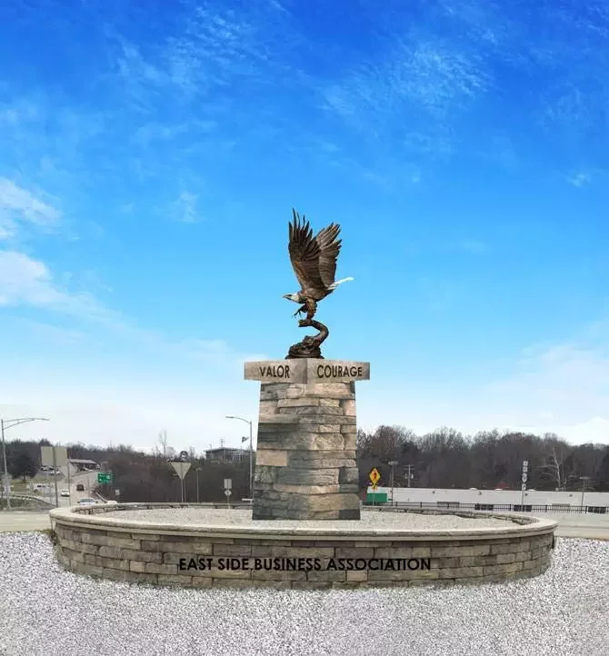 In 2019, JCESBA teamed up with American Legion to create patriotic displays in the two roundabouts on East McCarty Street, fulfilling our ongoing goals of beautification on the eastside. The north roundabout displays a 6’ tall eagle statue atop a pedestal of stone. The south roundabout features a 40’ tall flag pole with a pentagon-shaped monument displaying patriotic messages around the base. We appreciate the other community partners who helped in the initial funding and ongoing upkeep of the roundabouts.
